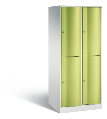 Die nach vorne gewölbte Flügeltür ist absolut stabil und vandalismussicher, sogar gegen Fußtritte. Die einschlagenden Türen sind in robusten, innenliegenden Drehstangenscharnieren aufgehängt und halte damit auch hohen Beanspruchungen stand. Jede Tür ist serienmäßig mit einer Anschlagsdämpfung ausgestattet, so dass, auch durch ein schwungvolles Schließen, die Tür nicht zuknallt. Das trägt nicht nur zu einer angenehmeren Geräuschkulisse bei, sondern schont auch den Stahlschrank vor Beschädigungen. Zudem schützt die Türöffnungsbegrenzung vor einer Überdehnung der Tür und vor der Überschneidung der Nutzfläche mit dem Nachbarschrank. Verschließbar mit Zylinderschloss. Die Lüftungsöffnungen in der Rückwand stellen eine gute Luftzirkulation in jedem Schrankfach sicher. Durch die Abdeckplatte kann der Beistellschrank als zusätzliche Arbeits- oder Ablagefläche genutzt werden. Der untergebaute Sockel sorgt dafür, dass das Gewicht des Schrankes gleichmäßig auf dem Boden verteilt wird. Dies erhöht die Stabilität und der Schrank kann schwerer Lasten aufnehmen, als ein Schrank mit Füßen. Außerdem können Schmutz, Staub und Feuchtigkeit nicht unter den Schrank gelangen, was die Reinigungsfläche verkleinert. Konstruktion aus Stahlblech, verschweißt. Korpus mit Einbrennlackierung. Front mit Einbrennlackierung.