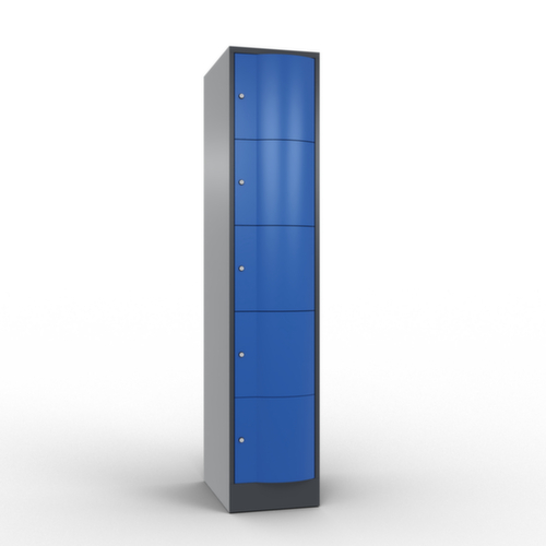 Die nach vorne gewölbte Flügeltür ist absolut stabil und vandalismussicher, sogar gegen Fußtritte. Die einschlagenden Türen sind in robusten, innenliegenden Drehstangenscharnieren aufgehängt und halte damit auch hohen Beanspruchungen stand. Jede Tür ist serienmäßig mit einer Anschlagsdämpfung ausgestattet, so dass, auch durch ein schwungvolles Schließen, die Tür nicht zuknallt. Das trägt nicht nur zu einer angenehmeren Geräuschkulisse bei, sondern schont auch den Stahlschrank vor Beschädigungen. Zudem schützt die Türöffnungsbegrenzung vor einer Überdehnung der Tür und vor der Überschneidung der Nutzfläche mit dem Nachbarschrank. Verschließbar mit Zylinderschloss. Die Lüftungsöffnungen in der Rückwand stellen eine gute Luftzirkulation in jedem Schrankfach sicher. Durch die Abdeckplatte kann der Beistellschrank als zusätzliche Arbeits- oder Ablagefläche genutzt werden. Der untergebaute Sockel sorgt dafür, dass das Gewicht des Schrankes gleichmäßig auf dem Boden verteilt wird. Dies erhöht die Stabilität und der Schrank kann schwerer Lasten aufnehmen, als ein Schrank mit Füßen. Außerdem können Schmutz, Staub und Feuchtigkeit nicht unter den Schrank gelangen, was die Reinigungsfläche verkleinert. Konstruktion aus Stahlblech, verschweißt. Korpus mit Einbrennlackierung. Front mit Einbrennlackierung.