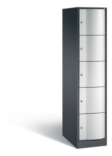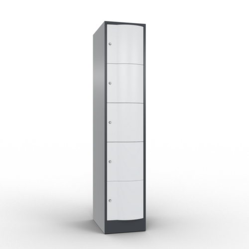 Die nach vorne gewölbte Flügeltür ist absolut stabil und vandalismussicher, sogar gegen Fußtritte. Die einschlagenden Türen sind in robusten, innenliegenden Drehstangenscharnieren aufgehängt und halte damit auch hohen Beanspruchungen stand. Jede Tür ist serienmäßig mit einer Anschlagsdämpfung ausgestattet, so dass, auch durch ein schwungvolles Schließen, die Tür nicht zuknallt. Das trägt nicht nur zu einer angenehmeren Geräuschkulisse bei, sondern schont auch den Stahlschrank vor Beschädigungen. Zudem schützt die Türöffnungsbegrenzung vor einer Überdehnung der Tür und vor der Überschneidung der Nutzfläche mit dem Nachbarschrank. Verschließbar mit Zylinderschloss. Die Lüftungsöffnungen in der Rückwand stellen eine gute Luftzirkulation in jedem Schrankfach sicher. Durch die Abdeckplatte kann der Beistellschrank als zusätzliche Arbeits- oder Ablagefläche genutzt werden. Der untergebaute Sockel sorgt dafür, dass das Gewicht des Schrankes gleichmäßig auf dem Boden verteilt wird. Dies erhöht die Stabilität und der Schrank kann schwerer Lasten aufnehmen, als ein Schrank mit Füßen. Außerdem können Schmutz, Staub und Feuchtigkeit nicht unter den Schrank gelangen, was die Reinigungsfläche verkleinert. Konstruktion aus Stahlblech, verschweißt. Korpus mit Einbrennlackierung. Front mit Einbrennlackierung.