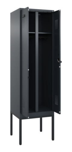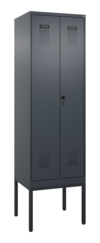 Die wichtigsten Maße des C+P Garderobenschranks Evolo PLUS auf einen Blick:Je Abteil ein festverschweißter Hutboden und darunter eine Kleiderstange mit 3 verdrehsicheren Doppelschiebehaken. Die Doppel-Flügeltüren können über den Comfort-Etikettrahmen ganz einfach personalisiert werden. Dank des Desinglochbildes, was essentiell zur Belüftung beiträgt, bleibt der Schrank trotzdem in seinem gesamten Erscheinungsbild glatt, hygienisch und leicht zu reinigen. Die innenliegenden Drehbolzen der einschlagenden Türen bieten den Vorteil einer sauberen Optik, da keine Schrauben oder Scharniere von außen sichtbar sind. Dadurch wird das Design des Schrankes nicht beeinträchtigt und das gesamte Möbelstück wirkt hochwertiger. Damit ist auch die glatte Oberfläche leichter zu reinigen, da keine Schmutz- oder Staubablagerungen an unzugänglichen Stellen zu befürchten sind. Jede Tür ist serienmäßig mit einer Anschlagsdämpfung ausgestattet, so dass, auch durch ein schwungvolles Schließen, die Tür nicht zuknallt. Das trägt nicht nur zu einer angenehmeren Geräuschkulisse bei, sondern schont auch den Stahlschrank vor Beschädigungen. Von der Natur inspiriert schafft der BIONIC Steel Frame eine besonders effiziente und stabile Konstruktion. Durch eine raffinierte innere Struktur aus Faltungen, Streben und Zwischenräumen, sowie höhere Materialstärke an entscheidenden Stellen, wie z. B. im vorderen Bereich der Seitenwände und in den Trennwand- und Kastenprofilen, wird die Verwindungssteifigkeit zusätzlich erhöht. Pro Person stehen 2 Abteile zur Verfügung, die über die zueinander schlagenden Türen gemeinsam verschließbar sind. Dadurch ist eine strikte und saubere Trennung von Arbeits- und Alltagskleidung ganz einfach möglich. Das durchdachte Selbstbelüftungskonzept ermöglicht einen konstruktiv optimierte Luftzirkulation. Definierte Lüftungsfreiräume vor und hinter dem Ablageboden, Lüftungsöffnungen in Abteilboden und -dach, in Kombination mit dem Lochbild in der Tür, tragen zu einer angenehmen Strömungsverlauf bei. . Dadurch wird der Schrankinhalt ausreichend belüftet und trocknet schneller, ohne unangenehme Gerüche zu verursachen. Das untergebaute Fußgestell reduziert mögliche Ansammlungen von Schmutz und Staub, da eine vollflächige Reinigung einfach möglich ist. Zudem wird zusätzlicher Stauraum unter dem Schrank geschaffen. Schuhe und Taschen stehen nicht mehr im Raum und stellen weniger Stolpergefahr dar. Konstruktion aus Stahl, stabil verschweißt. Das macht die Konstruktion besonders robust und widerstandsfähig und somit langlebiger. Die verschweißten Ecken und Kanten des Korpus gewährleisten eine höhere Dichtigkeit und somit eine bessere Schutzfunktion gegen Staub, Feuchtigkeit und Schmutz als eine geschraubte Konstruktion. Zudem sind keine regelmäßigen Wartungsarbeiten und Nachjustierungen nötig. Korpus mit Einbrennlackierung in RAL7016 Anthrazitgrau, Front mit Einbrennlackierung in RAL7016 Anthrazitgrau.