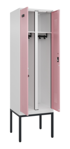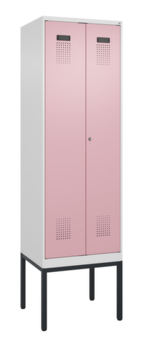 Die wichtigsten Maße des C+P Garderobenschranks Evolo PLUS auf einen Blick:Je Abteil ein festverschweißter Hutboden und darunter eine Kleiderstange mit 3 verdrehsicheren Doppelschiebehaken. Die Doppel-Flügeltüren können über den Comfort-Etikettrahmen ganz einfach personalisiert werden. Dank des Desinglochbildes, was essentiell zur Belüftung beiträgt, bleibt der Schrank trotzdem in seinem gesamten Erscheinungsbild glatt, hygienisch und leicht zu reinigen. Die innenliegenden Drehbolzen der einschlagenden Türen bieten den Vorteil einer sauberen Optik, da keine Schrauben oder Scharniere von außen sichtbar sind. Dadurch wird das Design des Schrankes nicht beeinträchtigt und das gesamte Möbelstück wirkt hochwertiger. Damit ist auch die glatte Oberfläche leichter zu reinigen, da keine Schmutz- oder Staubablagerungen an unzugänglichen Stellen zu befürchten sind. Jede Tür ist serienmäßig mit einer Anschlagsdämpfung ausgestattet, so dass, auch durch ein schwungvolles Schließen, die Tür nicht zuknallt. Das trägt nicht nur zu einer angenehmeren Geräuschkulisse bei, sondern schont auch den Stahlschrank vor Beschädigungen. Von der Natur inspiriert schafft der BIONIC Steel Frame eine besonders effiziente und stabile Konstruktion. Durch eine raffinierte innere Struktur aus Faltungen, Streben und Zwischenräumen, sowie höhere Materialstärke an entscheidenden Stellen, wie z. B. im vorderen Bereich der Seitenwände und in den Trennwand- und Kastenprofilen, wird die Verwindungssteifigkeit zusätzlich erhöht. Verschließbar mit Zylinderschloss. Pro Person stehen 2 Abteile zur Verfügung, die über die zueinander schlagenden Türen gemeinsam verschließbar sind. Dadurch ist eine strikte und saubere Trennung von Arbeits- und Alltagskleidung ganz einfach möglich. Das durchdachte Selbstbelüftungskonzept ermöglicht einen konstruktiv optimierte Luftzirkulation. Definierte Lüftungsfreiräume vor und hinter dem Ablageboden, Lüftungsöffnungen in Abteilboden und -dach, in Kombination mit dem Lochbild in der Tür, tragen zu einer angenehmen Strömungsverlauf bei. . Dadurch wird der Schrankinhalt ausreichend belüftet und trocknet schneller, ohne unangenehme Gerüche zu verursachen. Das untergebaute Fußgestell reduziert mögliche Ansammlungen von Schmutz und Staub, da eine vollflächige Reinigung einfach möglich ist. Zudem wird zusätzlicher Stauraum unter dem Schrank geschaffen. Schuhe und Taschen stehen nicht mehr im Raum und stellen weniger Stolpergefahr dar. Konstruktion aus Stahl, stabil verschweißt. Das macht die Konstruktion besonders robust und widerstandsfähig und somit langlebiger. Die verschweißten Ecken und Kanten des Korpus gewährleisten eine höhere Dichtigkeit und somit eine bessere Schutzfunktion gegen Staub, Feuchtigkeit und Schmutz als eine geschraubte Konstruktion. Zudem sind keine regelmäßigen Wartungsarbeiten und Nachjustierungen nötig. Korpus mit Einbrennlackierung in RAL9016 Verkehrsweiß, Front mit Einbrennlackierung in RAL3015 Hellrosa.