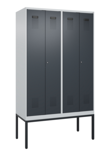 Die wichtigsten Maße des C+P Garderobenschranks Evolo PLUS auf einen Blick:Je Abteil ein festverschweißter Hutboden und darunter eine Kleiderstange mit 3 verdrehsicheren Doppelschiebehaken. Die Doppel-Flügeltüren können über den Comfort-Etikettrahmen ganz einfach personalisiert werden. Dank des Desinglochbildes, was essentiell zur Belüftung beiträgt, bleibt der Schrank trotzdem in seinem gesamten Erscheinungsbild glatt, hygienisch und leicht zu reinigen. Die innenliegenden Drehbolzen der einschlagenden Türen bieten den Vorteil einer sauberen Optik, da keine Schrauben oder Scharniere von außen sichtbar sind. Dadurch wird das Design des Schrankes nicht beeinträchtigt und das gesamte Möbelstück wirkt hochwertiger. Damit ist auch die glatte Oberfläche leichter zu reinigen, da keine Schmutz- oder Staubablagerungen an unzugänglichen Stellen zu befürchten sind. Jede Tür ist serienmäßig mit einer Anschlagsdämpfung ausgestattet, so dass, auch durch ein schwungvolles Schließen, die Tür nicht zuknallt. Das trägt nicht nur zu einer angenehmeren Geräuschkulisse bei, sondern schont auch den Stahlschrank vor Beschädigungen. Von der Natur inspiriert schafft der BIONIC Steel Frame eine besonders effiziente und stabile Konstruktion. Durch eine raffinierte innere Struktur aus Faltungen, Streben und Zwischenräumen, sowie höhere Materialstärke an entscheidenden Stellen, wie z. B. im vorderen Bereich der Seitenwände und in den Trennwand- und Kastenprofilen, wird die Verwindungssteifigkeit zusätzlich erhöht. Verschließbar mit Zylinderschloss. Pro Person stehen 2 Abteile zur Verfügung, die über die zueinander schlagenden Türen gemeinsam verschließbar sind. Dadurch ist eine strikte und saubere Trennung von Arbeits- und Alltagskleidung ganz einfach möglich. Das durchdachte Selbstbelüftungskonzept ermöglicht einen konstruktiv optimierte Luftzirkulation. Definierte Lüftungsfreiräume vor und hinter dem Ablageboden, Lüftungsöffnungen in Abteilboden und -dach, in Kombination mit dem Lochbild in der Tür, tragen zu einer angenehmen Strömungsverlauf bei. . Dadurch wird der Schrankinhalt ausreichend belüftet und trocknet schneller, ohne unangenehme Gerüche zu verursachen. Das untergebaute Fußgestell reduziert mögliche Ansammlungen von Schmutz und Staub, da eine vollflächige Reinigung einfach möglich ist. Zudem wird zusätzlicher Stauraum unter dem Schrank geschaffen. Schuhe und Taschen stehen nicht mehr im Raum und stellen weniger Stolpergefahr dar. Konstruktion aus Stahl, stabil verschweißt. Das macht die Konstruktion besonders robust und widerstandsfähig und somit langlebiger. Die verschweißten Ecken und Kanten des Korpus gewährleisten eine höhere Dichtigkeit und somit eine bessere Schutzfunktion gegen Staub, Feuchtigkeit und Schmutz als eine geschraubte Konstruktion. Zudem sind keine regelmäßigen Wartungsarbeiten und Nachjustierungen nötig. Korpus mit Einbrennlackierung in RAL7035 Lichtgrau, Front mit Einbrennlackierung in RAL7016 Anthrazitgrau.