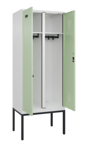 Die wichtigsten Maße des C+P Garderobenschranks Evolo PLUS auf einen Blick:Je Abteil ein festverschweißter Hutboden und darunter eine Kleiderstange mit 3 verdrehsicheren Doppelschiebehaken. Die Doppel-Flügeltüren können über den Comfort-Etikettrahmen ganz einfach personalisiert werden. Dank des Desinglochbildes, was essentiell zur Belüftung beiträgt, bleibt der Schrank trotzdem in seinem gesamten Erscheinungsbild glatt, hygienisch und leicht zu reinigen. Die innenliegenden Drehbolzen der einschlagenden Türen bieten den Vorteil einer sauberen Optik, da keine Schrauben oder Scharniere von außen sichtbar sind. Dadurch wird das Design des Schrankes nicht beeinträchtigt und das gesamte Möbelstück wirkt hochwertiger. Damit ist auch die glatte Oberfläche leichter zu reinigen, da keine Schmutz- oder Staubablagerungen an unzugänglichen Stellen zu befürchten sind. Jede Tür ist serienmäßig mit einer Anschlagsdämpfung ausgestattet, so dass, auch durch ein schwungvolles Schließen, die Tür nicht zuknallt. Das trägt nicht nur zu einer angenehmeren Geräuschkulisse bei, sondern schont auch den Stahlschrank vor Beschädigungen. Von der Natur inspiriert schafft der BIONIC Steel Frame eine besonders effiziente und stabile Konstruktion. Durch eine raffinierte innere Struktur aus Faltungen, Streben und Zwischenräumen, sowie höhere Materialstärke an entscheidenden Stellen, wie z. B. im vorderen Bereich der Seitenwände und in den Trennwand- und Kastenprofilen, wird die Verwindungssteifigkeit zusätzlich erhöht. Verschließbar mit Zylinderschloss. Pro Person stehen 2 Abteile zur Verfügung, die über die zueinander schlagenden Türen gemeinsam verschließbar sind. Dadurch ist eine strikte und saubere Trennung von Arbeits- und Alltagskleidung ganz einfach möglich. Das durchdachte Selbstbelüftungskonzept ermöglicht einen konstruktiv optimierte Luftzirkulation. Definierte Lüftungsfreiräume vor und hinter dem Ablageboden, Lüftungsöffnungen in Abteilboden und -dach, in Kombination mit dem Lochbild in der Tür, tragen zu einer angenehmen Strömungsverlauf bei. . Dadurch wird der Schrankinhalt ausreichend belüftet und trocknet schneller, ohne unangenehme Gerüche zu verursachen. Das untergebaute Fußgestell reduziert mögliche Ansammlungen von Schmutz und Staub, da eine vollflächige Reinigung einfach möglich ist. Zudem wird zusätzlicher Stauraum unter dem Schrank geschaffen. Schuhe und Taschen stehen nicht mehr im Raum und stellen weniger Stolpergefahr dar. Konstruktion aus Stahl, stabil verschweißt. Das macht die Konstruktion besonders robust und widerstandsfähig und somit langlebiger. Die verschweißten Ecken und Kanten des Korpus gewährleisten eine höhere Dichtigkeit und somit eine bessere Schutzfunktion gegen Staub, Feuchtigkeit und Schmutz als eine geschraubte Konstruktion. Zudem sind keine regelmäßigen Wartungsarbeiten und Nachjustierungen nötig. Korpus mit Einbrennlackierung in RAL9016 Verkehrsweiß, Front mit Einbrennlackierung in RAL6019 Weißgrün.