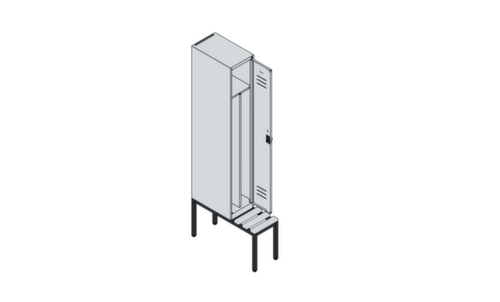 Die wichtigsten Maße des C+P Garderobenschranks Classic Plus auf einen Blick:Je Abteil Hutboden, Kleiderstange, Haken. Das Abteil wird unter dem Hutboden durch eine Mitteltrennwand unterteilt. Dadurch ist eine saubere Schwarz-Weiß-Trennung von Arbeits- und Alltagskleidung möglich. Flügeltür mit Etikettenrahmen und Lüftungsschlitzen. Die innenliegenden Drehbolzen der einschlagenden Türen bieten den Vorteil einer sauberen Optik, da keine Schrauben oder Scharniere von außen sichtbar sind. Dadurch wird das Design des Schrankes nicht beeinträchtigt und das gesamte Möbelstück wirkt hochwertiger. Damit ist auch die glatte Oberfläche leichter zu reinigen, da keine Schmutz- oder Staubablagerungen an unzugänglichen Stellen zu befürchten sind. Jede Tür ist serienmäßig mit einer Anschlagsdämpfung ausgestattet, so dass, auch durch ein schwungvolles Schließen, die Tür nicht zuknallt. Das trägt nicht nur zu einer angenehmeren Geräuschkulisse bei, sondern schont auch den Stahlschrank vor Beschädigungen. Von der Natur inspiriert schafft der BIONIC Steel Frame eine besonders effiziente und stabile Konstruktion. Durch eine raffinierte innere Struktur aus Faltungen, Streben und Zwischenräumen, sowie höhere Materialstärke an entscheidenden Stellen, wie z. B. im vorderen Bereich der Seitenwände und in den Trennwand- und Kastenprofilen, wird die Verwindungssteifigkeit zusätzlich erhöht. Verschließbar mit Zylinderschloss. Die zusätzlichen Lüftungsöffnungen im Abteil, kombiniert mit den Lüftungsschlitzen in der Tür, verbessern den Luftstrom. Dadurch wird der Schrankinhalt besser belüftet und trocknet schneller, ohne unangenehme Gerüche zu verursachen. Die untergebaute Sitzbank sorgt für eine effiziente Nutzung des verfügbaren Raumes. Sie ermöglicht ein bequemes An- und Ausziehen und bietet direkt noch Stauraum, ohne zusätzlichen Platz zu beanspruchen. Die Leisten sind aus Kunststoff. Konstruktion aus Stahl, stabil verschweißt. Das macht die Konstruktion besonders robust und widerstandsfähig und somit langlebiger. Die verschweißten Ecken und Kanten des Korpus gewährleisten eine höhere Dichtigkeit und somit eine bessere Schutzfunktion gegen Staub, Feuchtigkeit und Schmutz als eine geschraubte Konstruktion. Zudem sind keine regelmäßigen Wartungsarbeiten und Nachjustierungen nötig. Korpus mit Einbrennlackierung in RAL7035 Lichtgrau, Front mit Einbrennlackierung in RAL5012 Lichtblau.