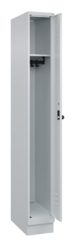 Die wichtigsten Maße des C+P Garderobenschranks Classic Plus auf einen Blick:Je Abteil ein festverschweißter Hutboden und darunter eine Kleiderstange mit 3 verdrehsicheren Doppelschiebehaken. Flügeltür mit Etikettenrahmen und Lüftungsschlitzen. Die innenliegenden Drehbolzen der einschlagenden Türen bieten den Vorteil einer sauberen Optik, da keine Schrauben oder Scharniere von außen sichtbar sind. Dadurch wird das Design des Schrankes nicht beeinträchtigt und das gesamte Möbelstück wirkt hochwertiger. Damit ist auch die glatte Oberfläche leichter zu reinigen, da keine Schmutz- oder Staubablagerungen an unzugänglichen Stellen zu befürchten sind. Jede Tür ist serienmäßig mit einer Anschlagsdämpfung ausgestattet, so dass, auch durch ein schwungvolles Schließen, die Tür nicht zuknallt. Das trägt nicht nur zu einer angenehmeren Geräuschkulisse bei, sondern schont auch den Stahlschrank vor Beschädigungen. Von der Natur inspiriert schafft der BIONIC Steel Frame eine besonders effiziente und stabile Konstruktion. Durch eine raffinierte innere Struktur aus Faltungen, Streben und Zwischenräumen, sowie höhere Materialstärke an entscheidenden Stellen, wie z. B. im vorderen Bereich der Seitenwände und in den Trennwand- und Kastenprofilen, wird die Verwindungssteifigkeit zusätzlich erhöht. Verschließbar mit Sicherheits-Drehriegel für Vorhängeschloss. Das Sicherheitsschloss ist besonders aufbruchsicher, da es im verschlossenen Zustand durchdreht und erst nach Entfernung des Schlosses einrastet. Passend für alle Vorhängeschlösser mit einer Bügelstärke von 6 - 8 mm. Die zusätzlichen Lüftungsöffnungen im Abteil, kombiniert mit den Lüftungsschlitzen in der Tür, verbessern den Luftstrom. Dadurch wird der Schrankinhalt besser belüftet und trocknet schneller, ohne unangenehme Gerüche zu verursachen. Der untergebaute Sockel sorgt dafür, dass das Gewicht des Schrankes gleichmäßig auf dem Boden verteilt wird. Dies erhöht die Stabilität und der Schrank kann schwerer Lasten aufnehmen, als ein Schrank mit Füßen. Außerdem können Schmutz, Staub und Feuchtigkeit nicht unter den Schrank gelangen, was die Reinigungsfläche verkleinert. Konstruktion aus Stahl, stabil verschweißt. Das macht die Konstruktion besonders robust und widerstandsfähig und somit langlebiger. Die verschweißten Ecken und Kanten des Korpus gewährleisten eine höhere Dichtigkeit und somit eine bessere Schutzfunktion gegen Staub, Feuchtigkeit und Schmutz als eine geschraubte Konstruktion. Zudem sind keine regelmäßigen Wartungsarbeiten und Nachjustierungen nötig. Korpus mit Einbrennlackierung in RAL7035 Lichtgrau, Front mit Einbrennlackierung in RAL7035 Lichtgrau.