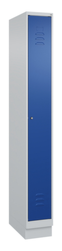 Die wichtigsten Maße des C+P Garderobenschranks Classic Plus auf einen Blick:Je Abteil ein festverschweißter Hutboden und darunter eine Kleiderstange mit 3 verdrehsicheren Doppelschiebehaken. Flügeltür mit Etikettenrahmen und Lüftungsschlitzen. Die innenliegenden Drehbolzen der einschlagenden Türen bieten den Vorteil einer sauberen Optik, da keine Schrauben oder Scharniere von außen sichtbar sind. Dadurch wird das Design des Schrankes nicht beeinträchtigt und das gesamte Möbelstück wirkt hochwertiger. Damit ist auch die glatte Oberfläche leichter zu reinigen, da keine Schmutz- oder Staubablagerungen an unzugänglichen Stellen zu befürchten sind. Jede Tür ist serienmäßig mit einer Anschlagsdämpfung ausgestattet, so dass, auch durch ein schwungvolles Schließen, die Tür nicht zuknallt. Das trägt nicht nur zu einer angenehmeren Geräuschkulisse bei, sondern schont auch den Stahlschrank vor Beschädigungen. Von der Natur inspiriert schafft der BIONIC Steel Frame eine besonders effiziente und stabile Konstruktion. Durch eine raffinierte innere Struktur aus Faltungen, Streben und Zwischenräumen, sowie höhere Materialstärke an entscheidenden Stellen, wie z. B. im vorderen Bereich der Seitenwände und in den Trennwand- und Kastenprofilen, wird die Verwindungssteifigkeit zusätzlich erhöht. Verschließbar mit Zylinderschloss. Die zusätzlichen Lüftungsöffnungen im Abteil, kombiniert mit den Lüftungsschlitzen in der Tür, verbessern den Luftstrom. Dadurch wird der Schrankinhalt besser belüftet und trocknet schneller, ohne unangenehme Gerüche zu verursachen. Der untergebaute Sockel sorgt dafür, dass das Gewicht des Schrankes gleichmäßig auf dem Boden verteilt wird. Dies erhöht die Stabilität und der Schrank kann schwerer Lasten aufnehmen, als ein Schrank mit Füßen. Außerdem können Schmutz, Staub und Feuchtigkeit nicht unter den Schrank gelangen, was die Reinigungsfläche verkleinert. Konstruktion aus Stahl, stabil verschweißt. Das macht die Konstruktion besonders robust und widerstandsfähig und somit langlebiger. Die verschweißten Ecken und Kanten des Korpus gewährleisten eine höhere Dichtigkeit und somit eine bessere Schutzfunktion gegen Staub, Feuchtigkeit und Schmutz als eine geschraubte Konstruktion. Zudem sind keine regelmäßigen Wartungsarbeiten und Nachjustierungen nötig. Korpus mit Einbrennlackierung in RAL7035 Lichtgrau, Front mit Einbrennlackierung in RAL5010 Enzianblau.