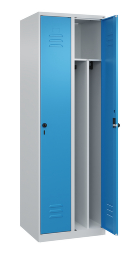 Die wichtigsten Maße des C+P Garderobenschranks Classic Plus auf einen Blick:Je Abteil ein festverschweißter Hutboden und darunter eine Kleiderstange mit 3 verdrehsicheren Doppelschiebehaken. Das Abteil wird unter dem Hutboden durch eine Mitteltrennwand unterteilt. Dadurch ist eine saubere Schwarz-Weiß-Trennung von Arbeits- und Alltagskleidung möglich. Flügeltür mit Etikettenrahmen und Lüftungsschlitzen. Die innenliegenden Drehbolzen der einschlagenden Türen bieten den Vorteil einer sauberen Optik, da keine Schrauben oder Scharniere von außen sichtbar sind. Dadurch wird das Design des Schrankes nicht beeinträchtigt und das gesamte Möbelstück wirkt hochwertiger. Damit ist auch die glatte Oberfläche leichter zu reinigen, da keine Schmutz- oder Staubablagerungen an unzugänglichen Stellen zu befürchten sind. Jede Tür ist serienmäßig mit einer Anschlagsdämpfung ausgestattet, so dass, auch durch ein schwungvolles Schließen, die Tür nicht zuknallt. Das trägt nicht nur zu einer angenehmeren Geräuschkulisse bei, sondern schont auch den Stahlschrank vor Beschädigungen. Von der Natur inspiriert schafft der BIONIC Steel Frame eine besonders effiziente und stabile Konstruktion. Durch eine raffinierte innere Struktur aus Faltungen, Streben und Zwischenräumen, sowie höhere Materialstärke an entscheidenden Stellen, wie z. B. im vorderen Bereich der Seitenwände und in den Trennwand- und Kastenprofilen, wird die Verwindungssteifigkeit zusätzlich erhöht. Verschließbar mit Sicherheits-Drehriegel für Vorhängeschloss. Das Sicherheitsschloss ist besonders aufbruchsicher, da es im verschlossenen Zustand durchdreht und erst nach Entfernung des Schlosses einrastet. Passend für alle Vorhängeschlösser mit einer Bügelstärke von 6 - 8 mm. Die zusätzlichen Lüftungsöffnungen im Abteil, kombiniert mit den Lüftungsschlitzen in der Tür, verbessern den Luftstrom. Dadurch wird der Schrankinhalt besser belüftet und trocknet schneller, ohne unangenehme Gerüche zu verursachen. Für eine besonders schlanke und raumsparende Optik steht der Schrank ohne Sockel oder Füße direkt auf dem Boden. Lediglich Bodenausgleichsschrauben sorgen für einen wackelfreien Stand bei eventuellen Bodenunebenheiten. Der Schrankboden ist für einen erhöhten Korrosionsschutz zusätzlich verzinkt. Konstruktion aus Stahl, stabil verschweißt. Das macht die Konstruktion besonders robust und widerstandsfähig und somit langlebiger. Die verschweißten Ecken und Kanten des Korpus gewährleisten eine höhere Dichtigkeit und somit eine bessere Schutzfunktion gegen Staub, Feuchtigkeit und Schmutz als eine geschraubte Konstruktion. Zudem sind keine regelmäßigen Wartungsarbeiten und Nachjustierungen nötig. Korpus mit Einbrennlackierung in RAL7035 Lichtgrau, Front mit Einbrennlackierung in RAL5012 Lichtblau.