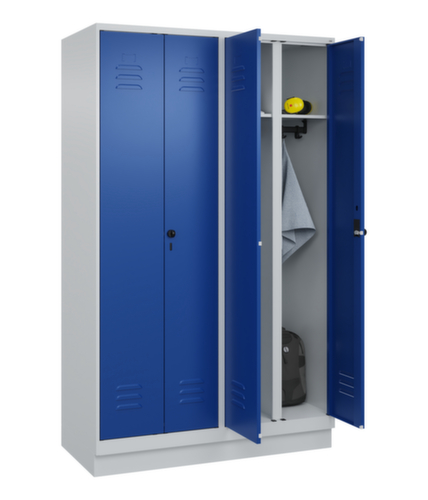 Die wichtigsten Maße des C+P Garderobenschranks Classic Plus auf einen Blick:Je Abteil ein festverschweißter Hutboden und darunter eine Kleiderstange mit 3 verdrehsicheren Doppelschiebehaken. Flügeltür mit Etikettenrahmen und Lüftungsschlitzen. Die innenliegenden Drehbolzen der einschlagenden Türen bieten den Vorteil einer sauberen Optik, da keine Schrauben oder Scharniere von außen sichtbar sind. Dadurch wird das Design des Schrankes nicht beeinträchtigt und das gesamte Möbelstück wirkt hochwertiger. Damit ist auch die glatte Oberfläche leichter zu reinigen, da keine Schmutz- oder Staubablagerungen an unzugänglichen Stellen zu befürchten sind. Jede Tür ist serienmäßig mit einer Anschlagsdämpfung ausgestattet, so dass, auch durch ein schwungvolles Schließen, die Tür nicht zuknallt. Das trägt nicht nur zu einer angenehmeren Geräuschkulisse bei, sondern schont auch den Stahlschrank vor Beschädigungen. Von der Natur inspiriert schafft der BIONIC Steel Frame eine besonders effiziente und stabile Konstruktion. Durch eine raffinierte innere Struktur aus Faltungen, Streben und Zwischenräumen, sowie höhere Materialstärke an entscheidenden Stellen, wie z. B. im vorderen Bereich der Seitenwände und in den Trennwand- und Kastenprofilen, wird die Verwindungssteifigkeit zusätzlich erhöht. Verschließbar mit Sicherheits-Drehriegel für Vorhängeschloss. Das Sicherheitsschloss ist besonders aufbruchsicher, da es im verschlossenen Zustand durchdreht und erst nach Entfernung des Schlosses einrastet. Passend für alle Vorhängeschlösser mit einer Bügelstärke von 6 - 8 mm. Pro Person stehen 2 Abteile zur Verfügung, die über die zueinander schlagenden Türen gemeinsam verschließbar sind. Dadurch ist eine strikte und saubere Trennung von Arbeits- und Alltagskleidung ganz einfach möglich. Die zusätzlichen Lüftungsöffnungen im Abteil, kombiniert mit den Lüftungsschlitzen in der Tür, verbessern den Luftstrom. Dadurch wird der Schrankinhalt besser belüftet und trocknet schneller, ohne unangenehme Gerüche zu verursachen. Der untergebaute Sockel sorgt dafür, dass das Gewicht des Schrankes gleichmäßig auf dem Boden verteilt wird. Dies erhöht die Stabilität und der Schrank kann schwerer Lasten aufnehmen, als ein Schrank mit Füßen. Außerdem können Schmutz, Staub und Feuchtigkeit nicht unter den Schrank gelangen, was die Reinigungsfläche verkleinert. Konstruktion aus Stahl, stabil verschweißt. Das macht die Konstruktion besonders robust und widerstandsfähig und somit langlebiger. Die verschweißten Ecken und Kanten des Korpus gewährleisten eine höhere Dichtigkeit und somit eine bessere Schutzfunktion gegen Staub, Feuchtigkeit und Schmutz als eine geschraubte Konstruktion. Zudem sind keine regelmäßigen Wartungsarbeiten und Nachjustierungen nötig. Korpus mit Einbrennlackierung in RAL7035 Lichtgrau, Front mit Einbrennlackierung in RAL5010 Enzianblau.