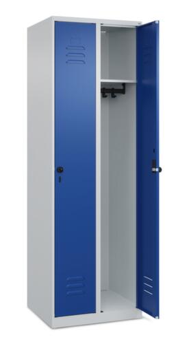 Die wichtigsten Maße des C+P Garderobenschranks Classic Plus auf einen Blick:Je Abteil ein festverschweißter Hutboden und darunter eine Kleiderstange mit 3 verdrehsicheren Doppelschiebehaken. Flügeltür mit Etikettenrahmen und Lüftungsschlitzen. Die innenliegenden Drehbolzen der einschlagenden Türen bieten den Vorteil einer sauberen Optik, da keine Schrauben oder Scharniere von außen sichtbar sind. Dadurch wird das Design des Schrankes nicht beeinträchtigt und das gesamte Möbelstück wirkt hochwertiger. Damit ist auch die glatte Oberfläche leichter zu reinigen, da keine Schmutz- oder Staubablagerungen an unzugänglichen Stellen zu befürchten sind. Jede Tür ist serienmäßig mit einer Anschlagsdämpfung ausgestattet, so dass, auch durch ein schwungvolles Schließen, die Tür nicht zuknallt. Das trägt nicht nur zu einer angenehmeren Geräuschkulisse bei, sondern schont auch den Stahlschrank vor Beschädigungen. Von der Natur inspiriert schafft der BIONIC Steel Frame eine besonders effiziente und stabile Konstruktion. Durch eine raffinierte innere Struktur aus Faltungen, Streben und Zwischenräumen, sowie höhere Materialstärke an entscheidenden Stellen, wie z. B. im vorderen Bereich der Seitenwände und in den Trennwand- und Kastenprofilen, wird die Verwindungssteifigkeit zusätzlich erhöht. Verschließbar mit Sicherheits-Drehriegel für Vorhängeschloss. Das Sicherheitsschloss ist besonders aufbruchsicher, da es im verschlossenen Zustand durchdreht und erst nach Entfernung des Schlosses einrastet. Passend für alle Vorhängeschlösser mit einer Bügelstärke von 6 - 8 mm. Die zusätzlichen Lüftungsöffnungen im Abteil, kombiniert mit den Lüftungsschlitzen in der Tür, verbessern den Luftstrom. Dadurch wird der Schrankinhalt besser belüftet und trocknet schneller, ohne unangenehme Gerüche zu verursachen. Für eine besonders schlanke und raumsparende Optik steht der Schrank ohne Sockel oder Füße direkt auf dem Boden. Lediglich Bodenausgleichsschrauben sorgen für einen wackelfreien Stand bei eventuellen Bodenunebenheiten. Der Schrankboden ist für einen erhöhten Korrosionsschutz zusätzlich verzinkt. Konstruktion aus Stahl, stabil verschweißt. Das macht die Konstruktion besonders robust und widerstandsfähig und somit langlebiger. Die verschweißten Ecken und Kanten des Korpus gewährleisten eine höhere Dichtigkeit und somit eine bessere Schutzfunktion gegen Staub, Feuchtigkeit und Schmutz als eine geschraubte Konstruktion. Zudem sind keine regelmäßigen Wartungsarbeiten und Nachjustierungen nötig. Korpus mit Einbrennlackierung in RAL7035 Lichtgrau, Front mit Einbrennlackierung in RAL5010 Enzianblau.