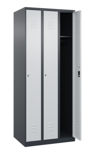 Die wichtigsten Maße des C+P Garderobenschranks Classic Plus auf einen Blick:Je Abteil ein festverschweißter Hutboden und darunter eine Kleiderstange mit 3 verdrehsicheren Doppelschiebehaken. Flügeltür mit Etikettenrahmen und Lüftungsschlitzen. Die innenliegenden Drehbolzen der einschlagenden Türen bieten den Vorteil einer sauberen Optik, da keine Schrauben oder Scharniere von außen sichtbar sind. Dadurch wird das Design des Schrankes nicht beeinträchtigt und das gesamte Möbelstück wirkt hochwertiger. Damit ist auch die glatte Oberfläche leichter zu reinigen, da keine Schmutz- oder Staubablagerungen an unzugänglichen Stellen zu befürchten sind. Jede Tür ist serienmäßig mit einer Anschlagsdämpfung ausgestattet, so dass, auch durch ein schwungvolles Schließen, die Tür nicht zuknallt. Das trägt nicht nur zu einer angenehmeren Geräuschkulisse bei, sondern schont auch den Stahlschrank vor Beschädigungen. Von der Natur inspiriert schafft der BIONIC Steel Frame eine besonders effiziente und stabile Konstruktion. Durch eine raffinierte innere Struktur aus Faltungen, Streben und Zwischenräumen, sowie höhere Materialstärke an entscheidenden Stellen, wie z. B. im vorderen Bereich der Seitenwände und in den Trennwand- und Kastenprofilen, wird die Verwindungssteifigkeit zusätzlich erhöht. Verschließbar mit Zylinderschloss. Die zusätzlichen Lüftungsöffnungen im Abteil, kombiniert mit den Lüftungsschlitzen in der Tür, verbessern den Luftstrom. Dadurch wird der Schrankinhalt besser belüftet und trocknet schneller, ohne unangenehme Gerüche zu verursachen. Für eine besonders schlanke und raumsparende Optik steht der Schrank ohne Sockel oder Füße direkt auf dem Boden. Lediglich Bodenausgleichsschrauben sorgen für einen wackelfreien Stand bei eventuellen Bodenunebenheiten. Der Schrankboden ist für einen erhöhten Korrosionsschutz zusätzlich verzinkt. Konstruktion aus Stahl, stabil verschweißt. Das macht die Konstruktion besonders robust und widerstandsfähig und somit langlebiger. Die verschweißten Ecken und Kanten des Korpus gewährleisten eine höhere Dichtigkeit und somit eine bessere Schutzfunktion gegen Staub, Feuchtigkeit und Schmutz als eine geschraubte Konstruktion. Zudem sind keine regelmäßigen Wartungsarbeiten und Nachjustierungen nötig. Korpus mit Einbrennlackierung in RAL7016 Anthrazitgrau, Front mit Einbrennlackierung in RAL7035 Lichtgrau.