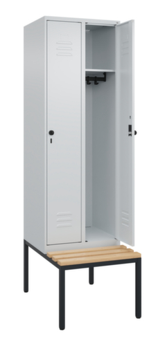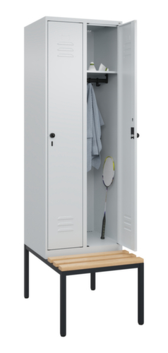 Die wichtigsten Maße des C+P Garderobenschranks Classic Plus auf einen Blick:Je Abteil ein festverschweißter Hutboden und darunter eine Kleiderstange mit 3 verdrehsicheren Doppelschiebehaken. Flügeltür mit Etikettenrahmen und Lüftungsschlitzen. Die innenliegenden Drehbolzen der einschlagenden Türen bieten den Vorteil einer sauberen Optik, da keine Schrauben oder Scharniere von außen sichtbar sind. Dadurch wird das Design des Schrankes nicht beeinträchtigt und das gesamte Möbelstück wirkt hochwertiger. Damit ist auch die glatte Oberfläche leichter zu reinigen, da keine Schmutz- oder Staubablagerungen an unzugänglichen Stellen zu befürchten sind. Jede Tür ist serienmäßig mit einer Anschlagsdämpfung ausgestattet, so dass, auch durch ein schwungvolles Schließen, die Tür nicht zuknallt. Das trägt nicht nur zu einer angenehmeren Geräuschkulisse bei, sondern schont auch den Stahlschrank vor Beschädigungen. Von der Natur inspiriert schafft der BIONIC Steel Frame eine besonders effiziente und stabile Konstruktion. Durch eine raffinierte innere Struktur aus Faltungen, Streben und Zwischenräumen, sowie höhere Materialstärke an entscheidenden Stellen, wie z. B. im vorderen Bereich der Seitenwände und in den Trennwand- und Kastenprofilen, wird die Verwindungssteifigkeit zusätzlich erhöht. Verschließbar mit Sicherheits-Drehriegel für Vorhängeschloss. Das Sicherheitsschloss ist besonders aufbruchsicher, da es im verschlossenen Zustand durchdreht und erst nach Entfernung des Schlosses einrastet. Passend für alle Vorhängeschlösser mit einer Bügelstärke von 6 - 8 mm. Die zusätzlichen Lüftungsöffnungen im Abteil, kombiniert mit den Lüftungsschlitzen in der Tür, verbessern den Luftstrom. Dadurch wird der Schrankinhalt besser belüftet und trocknet schneller, ohne unangenehme Gerüche zu verursachen. Die untergebaute Sitzbank sorgt für eine effiziente Nutzung des verfügbaren Raumes. Sie ermöglicht ein bequemes An- und Ausziehen und bietet direkt noch Stauraum, ohne zusätzlichen Platz zu beanspruchen. Die Leisten sind aus Buchenholz. Konstruktion aus Stahl, stabil verschweißt. Das macht die Konstruktion besonders robust und widerstandsfähig und somit langlebiger. Die verschweißten Ecken und Kanten des Korpus gewährleisten eine höhere Dichtigkeit und somit eine bessere Schutzfunktion gegen Staub, Feuchtigkeit und Schmutz als eine geschraubte Konstruktion. Zudem sind keine regelmäßigen Wartungsarbeiten und Nachjustierungen nötig. Korpus mit Einbrennlackierung in RAL7035 Lichtgrau, Front mit Einbrennlackierung in RAL7035 Lichtgrau.