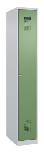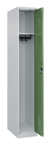 Die wichtigsten Maße des C+P Garderobenschranks Evolo PLUS auf einen Blick:Je Abteil ein festverschweißter Hutboden und darunter eine Kleiderstange mit 3 verdrehsicheren Doppelschiebehaken. Die Flügeltüren können über den Comfort-Etikettrahmen ganz einfach personalisiert werden. Dank des Desinglochbildes, was essentiell zur Belüftung beiträgt, bleibt der Schrank trotzdem in seinem gesamten Erscheinungsbild glatt, hygienisch und leicht zu reinigen. Die innenliegenden Drehbolzen der einschlagenden Türen bieten den Vorteil einer sauberen Optik, da keine Schrauben oder Scharniere von außen sichtbar sind. Dadurch wird das Design des Schrankes nicht beeinträchtigt und das gesamte Möbelstück wirkt hochwertiger. Damit ist auch die glatte Oberfläche leichter zu reinigen, da keine Schmutz- oder Staubablagerungen an unzugänglichen Stellen zu befürchten sind. Jede Tür ist serienmäßig mit einer Anschlagsdämpfung ausgestattet, so dass, auch durch ein schwungvolles Schließen, die Tür nicht zuknallt. Das trägt nicht nur zu einer angenehmeren Geräuschkulisse bei, sondern schont auch den Stahlschrank vor Beschädigungen. Von der Natur inspiriert schafft der BIONIC Steel Frame eine besonders effiziente und stabile Konstruktion. Durch eine raffinierte innere Struktur aus Faltungen, Streben und Zwischenräumen, sowie höhere Materialstärke an entscheidenden Stellen, wie z. B. im vorderen Bereich der Seitenwände und in den Trennwand- und Kastenprofilen, wird die Verwindungssteifigkeit zusätzlich erhöht. Verschließbar mit Zylinderschloss. Das durchdachte Selbstbelüftungskonzept ermöglicht einen konstruktiv optimierte Luftzirkulation. Definierte Lüftungsfreiräume vor und hinter dem Ablageboden, Lüftungsöffnungen in Abteilboden und -dach, in Kombination mit dem Lochbild in der Tür, tragen zu einer angenehmen Strömungsverlauf bei. . Dadurch wird der Schrankinhalt ausreichend belüftet und trocknet schneller, ohne unangenehme Gerüche zu verursachen. Für eine besonders schlanke und raumsparende Optik steht der Schrank ohne Sockel oder Füße direkt auf dem Boden. Lediglich Bodenausgleichsschrauben sorgen für einen wackelfreien Stand bei eventuellen Bodenunebenheiten. Der Schrankboden ist für einen erhöhten Korrosionsschutz zusätzlich verzinkt. Konstruktion aus Stahl, stabil verschweißt. Das macht die Konstruktion besonders robust und widerstandsfähig und somit langlebiger. Die verschweißten Ecken und Kanten des Korpus gewährleisten eine höhere Dichtigkeit und somit eine bessere Schutzfunktion gegen Staub, Feuchtigkeit und Schmutz als eine geschraubte Konstruktion. Zudem sind keine regelmäßigen Wartungsarbeiten und Nachjustierungen nötig. Korpus mit Einbrennlackierung in RAL7035 Lichtgrau, Front mit Einbrennlackierung in RAL6011 Resedagrün.