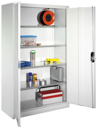 Die wichtigsten Maße des C+P Universalschrankes ERGO auf einen Blick:Der Schrankkorpus ist aus Stahlblech gefertigt und stabil verschweißt. Das macht die Konstruktion besonders robust und widerstandsfähig und somit langlebiger. Die verschweißten Ecken und Kanten des Korpus gewährleisten eine höhere Dichtigkeit und somit eine bessere Schutzfunktion gegen Staub, Feuchtigkeit und Schmutz als eine geschraubte Konstruktion. Zudem sind keine regelmäßigen Wartungsarbeiten und Nachjustierungen nötig. 4 Ebene(n) mit Stahlboden bieten ausreichend Stauraum um Aktenordner, Dokumente, Büromaterial oder auch Werkzeuge unterzubringen. Hohe Flexibilität der Inneneinrichtung durch Verstellbarkeit der Fachhöhen im Raster von 15 mm. Ausgestattet mit Böden. Über die Doppelflügeltür ist der Zugriff auf den Schrankinhalt besonders komfortabel. Das innenliegende Kastenprofil und die allseitige Abkantung erhöhen die Steifigkeit der Türen und macht sie widerstandsfähiger gegen Verformungen. Dadurch können sie auch stärkeren Belastungen standhalten und bieten einen hohen Diebstahlschutz. Verschließbar mit dem Griffschloss Ergo-Lock. Durch den großzügigen, ergonomischen Griffbügel lässt sich der Stahlschrank, auch mit Handschuhen, ganz einfach öffnen und durch den patentierten Mechanismus noch einfacher durch zudrücken wieder schließen. Für einen kontrollierten Zugriff auf den Inhalt ist das Ergo-Lock standardmäßig mit einem Sicherheitszylinderschloss ausgestattet. Die 3-Punkt-Verriegelung bietet hohe Stabilität und einen effektiven Einbruchschutz. Der untergebaute Sockel sorgt dafür, dass das Gewicht des Schrankes gleichmäßig auf dem Boden verteilt wird. Dies erhöht die Stabilität und der Schrank kann schwerer Lasten aufnehmen, als ein Schrank mit Füßen. Außerdem können Schmutz, Staub und Feuchtigkeit nicht unter den Schrank gelangen, was die Reinigungsfläche verkleinert.
