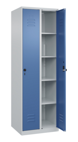 Die wichtigsten Maße des C+P Wäscheschranks Classic Plus auf einen Blick:Je Abteil 4 feste Fachböden. Flügeltür mit Etikettenrahmen und Lüftungsschlitzen. Die innenliegenden Drehbolzen der einschlagenden Türen bieten den Vorteil einer sauberen Optik, da keine Schrauben oder Scharniere von außen sichtbar sind. Dadurch wird das Design des Schrankes nicht beeinträchtigt und das gesamte Möbelstück wirkt hochwertiger. Damit ist auch die glatte Oberfläche leichter zu reinigen, da keine Schmutz- oder Staubablagerungen an unzugänglichen Stellen zu befürchten sind. Jede Tür ist serienmäßig mit einer Anschlagsdämpfung ausgestattet, so dass, auch durch ein schwungvolles Schließen, die Tür nicht zuknallt. Das trägt nicht nur zu einer angenehmeren Geräuschkulisse bei, sondern schont auch den Stahlschrank vor Beschädigungen. Von der Natur inspiriert schafft der BIONIC Steel Frame eine besonders effiziente und stabile Konstruktion. Durch eine raffinierte innere Struktur aus Faltungen, Streben und Zwischenräumen, sowie höhere Materialstärke an entscheidenden Stellen, wie z. B. im vorderen Bereich der Seitenwände und in den Trennwand- und Kastenprofilen, wird die Verwindungssteifigkeit zusätzlich erhöht. Verschließbar mit Sicherheits-Drehriegel für Vorhängeschloss. Das Sicherheitsschloss ist besonders aufbruchsicher, da es im verschlossenen Zustand durchdreht und erst nach Entfernung des Schlosses einrastet. Passend für alle Vorhängeschlösser mit einer Bügelstärke von 6 - 8 mm. Die zusätzlichen Lüftungsöffnungen im Abteil, kombiniert mit den Lüftungsschlitzen in der Tür, verbessern den Luftstrom. Dadurch wird der Schrankinhalt besser belüftet und trocknet schneller, ohne unangenehme Gerüche zu verursachen. Für eine besonders schlanke und raumsparende Optik steht der Schrank ohne Sockel oder Füße direkt auf dem Boden. Lediglich Bodenausgleichsschrauben sorgen für einen wackelfreien Stand bei eventuellen Bodenunebenheiten. Der Schrankboden ist für einen erhöhten Korrosionsschutz zusätzlich verzinkt. Konstruktion aus Stahl, stabil verschweißt. Das macht die Konstruktion besonders robust und widerstandsfähig und somit langlebiger. Die verschweißten Ecken und Kanten des Korpus gewährleisten eine höhere Dichtigkeit und somit eine bessere Schutzfunktion gegen Staub, Feuchtigkeit und Schmutz als eine geschraubte Konstruktion. Zudem sind keine regelmäßigen Wartungsarbeiten und Nachjustierungen nötig. Korpus mit Einbrennlackierung in RAL7035 Lichtgrau, Front mit Einbrennlackierung in RAL5023 Fernblau.