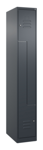 Die wichtigsten Maße des C+P Garderobenschranks Classic Plus auf einen Blick:Je Abteil eine Kleiderstange mit 3 verdrehsicheren Doppelschiebehaken. Flügeltür mit Etikettenrahmen und Lüftungsschlitzen. Die innenliegenden Drehbolzen der einschlagenden Türen bieten den Vorteil einer sauberen Optik, da keine Schrauben oder Scharniere von außen sichtbar sind. Dadurch wird das Design des Schrankes nicht beeinträchtigt und das gesamte Möbelstück wirkt hochwertiger. Damit ist auch die glatte Oberfläche leichter zu reinigen, da keine Schmutz- oder Staubablagerungen an unzugänglichen Stellen zu befürchten sind. Jede Tür ist serienmäßig mit einer Anschlagsdämpfung ausgestattet, so dass, auch durch ein schwungvolles Schließen, die Tür nicht zuknallt. Das trägt nicht nur zu einer angenehmeren Geräuschkulisse bei, sondern schont auch den Stahlschrank vor Beschädigungen. Von der Natur inspiriert schafft der BIONIC Steel Frame eine besonders effiziente und stabile Konstruktion. Durch eine raffinierte innere Struktur aus Faltungen, Streben und Zwischenräumen, sowie höhere Materialstärke an entscheidenden Stellen, wie z. B. im vorderen Bereich der Seitenwände und in den Trennwand- und Kastenprofilen, wird die Verwindungssteifigkeit zusätzlich erhöht. Verschließbar mit Zylinderschloss. Die zusätzlichen Lüftungsöffnungen im Abteil, kombiniert mit den Lüftungsschlitzen in der Tür, verbessern den Luftstrom. Dadurch wird der Schrankinhalt besser belüftet und trocknet schneller, ohne unangenehme Gerüche zu verursachen. Für eine besonders schlanke und raumsparende Optik steht der Schrank ohne Sockel oder Füße direkt auf dem Boden. Lediglich Bodenausgleichsschrauben sorgen für einen wackelfreien Stand bei eventuellen Bodenunebenheiten. Der Schrankboden ist für einen erhöhten Korrosionsschutz zusätzlich verzinkt. Konstruktion aus Stahl, stabil verschweißt. Das macht die Konstruktion besonders robust und widerstandsfähig und somit langlebiger. Die verschweißten Ecken und Kanten des Korpus gewährleisten eine höhere Dichtigkeit und somit eine bessere Schutzfunktion gegen Staub, Feuchtigkeit und Schmutz als eine geschraubte Konstruktion. Zudem sind keine regelmäßigen Wartungsarbeiten und Nachjustierungen nötig. Korpus mit Einbrennlackierung in RAL7016 Anthrazitgrau, Front mit Einbrennlackierung in RAL7016 Anthrazitgrau.