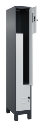 Die wichtigsten Maße des C+P Garderobenschranks Classic Plus auf einen Blick:Je Abteil eine Kleiderstange mit 3 verdrehsicheren Doppelschiebehaken. Flügeltür mit Etikettenrahmen und Lüftungsschlitzen. Die innenliegenden Drehbolzen der einschlagenden Türen bieten den Vorteil einer sauberen Optik, da keine Schrauben oder Scharniere von außen sichtbar sind. Dadurch wird das Design des Schrankes nicht beeinträchtigt und das gesamte Möbelstück wirkt hochwertiger. Damit ist auch die glatte Oberfläche leichter zu reinigen, da keine Schmutz- oder Staubablagerungen an unzugänglichen Stellen zu befürchten sind. Jede Tür ist serienmäßig mit einer Anschlagsdämpfung ausgestattet, so dass, auch durch ein schwungvolles Schließen, die Tür nicht zuknallt. Das trägt nicht nur zu einer angenehmeren Geräuschkulisse bei, sondern schont auch den Stahlschrank vor Beschädigungen. Von der Natur inspiriert schafft der BIONIC Steel Frame eine besonders effiziente und stabile Konstruktion. Durch eine raffinierte innere Struktur aus Faltungen, Streben und Zwischenräumen, sowie höhere Materialstärke an entscheidenden Stellen, wie z. B. im vorderen Bereich der Seitenwände und in den Trennwand- und Kastenprofilen, wird die Verwindungssteifigkeit zusätzlich erhöht. Verschließbar mit Sicherheits-Drehriegel für Vorhängeschloss. Das Sicherheitsschloss ist besonders aufbruchsicher, da es im verschlossenen Zustand durchdreht und erst nach Entfernung des Schlosses einrastet. Passend für alle Vorhängeschlösser mit einer Bügelstärke von 6 - 8 mm. Die zusätzlichen Lüftungsöffnungen im Abteil, kombiniert mit den Lüftungsschlitzen in der Tür, verbessern den Luftstrom. Dadurch wird der Schrankinhalt besser belüftet und trocknet schneller, ohne unangenehme Gerüche zu verursachen. Die untergebauten Füße aus Kunststoff verleihen dem Schrank nicht nur ein modernes und leichtes Erscheinungsbild und lassen ihn weniger massiv wirken, sondern bieten auch praktische Vorteile. Der offene Raum über dem Boden erleichtert die Reinigung und das Material Kunststoff bietet einen erhöhten Korrosionsschutz. Gerade in Umgebungen mit höheren Hygieneansprüchen ist dies ein wichtiger Aspekt. Konstruktion aus Stahl, stabil verschweißt. Das macht die Konstruktion besonders robust und widerstandsfähig und somit langlebiger. Die verschweißten Ecken und Kanten des Korpus gewährleisten eine höhere Dichtigkeit und somit eine bessere Schutzfunktion gegen Staub, Feuchtigkeit und Schmutz als eine geschraubte Konstruktion. Zudem sind keine regelmäßigen Wartungsarbeiten und Nachjustierungen nötig. Korpus mit Einbrennlackierung in RAL7016 Anthrazitgrau, Front mit Einbrennlackierung in RAL7035 Lichtgrau.