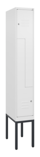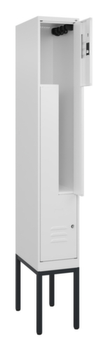 Die wichtigsten Maße des C+P Garderobenschranks Classic Plus auf einen Blick:Je Abteil eine Kleiderstange mit 3 verdrehsicheren Doppelschiebehaken. Flügeltür mit Etikettenrahmen und Lüftungsschlitzen. Die innenliegenden Drehbolzen der einschlagenden Türen bieten den Vorteil einer sauberen Optik, da keine Schrauben oder Scharniere von außen sichtbar sind. Dadurch wird das Design des Schrankes nicht beeinträchtigt und das gesamte Möbelstück wirkt hochwertiger. Damit ist auch die glatte Oberfläche leichter zu reinigen, da keine Schmutz- oder Staubablagerungen an unzugänglichen Stellen zu befürchten sind. Jede Tür ist serienmäßig mit einer Anschlagsdämpfung ausgestattet, so dass, auch durch ein schwungvolles Schließen, die Tür nicht zuknallt. Das trägt nicht nur zu einer angenehmeren Geräuschkulisse bei, sondern schont auch den Stahlschrank vor Beschädigungen. Von der Natur inspiriert schafft der BIONIC Steel Frame eine besonders effiziente und stabile Konstruktion. Durch eine raffinierte innere Struktur aus Faltungen, Streben und Zwischenräumen, sowie höhere Materialstärke an entscheidenden Stellen, wie z. B. im vorderen Bereich der Seitenwände und in den Trennwand- und Kastenprofilen, wird die Verwindungssteifigkeit zusätzlich erhöht. Verschließbar mit Zylinderschloss. Die zusätzlichen Lüftungsöffnungen im Abteil, kombiniert mit den Lüftungsschlitzen in der Tür, verbessern den Luftstrom. Dadurch wird der Schrankinhalt besser belüftet und trocknet schneller, ohne unangenehme Gerüche zu verursachen. Das untergebaute Fußgestell reduziert mögliche Ansammlungen von Schmutz und Staub, da eine vollflächige Reinigung einfach möglich ist. Zudem wird zusätzlicher Stauraum unter dem Schrank geschaffen. Schuhe und Taschen stehen nicht mehr im Raum und stellen weniger Stolpergefahr dar. Konstruktion aus Stahl, stabil verschweißt. Das macht die Konstruktion besonders robust und widerstandsfähig und somit langlebiger. Die verschweißten Ecken und Kanten des Korpus gewährleisten eine höhere Dichtigkeit und somit eine bessere Schutzfunktion gegen Staub, Feuchtigkeit und Schmutz als eine geschraubte Konstruktion. Zudem sind keine regelmäßigen Wartungsarbeiten und Nachjustierungen nötig. Korpus mit Einbrennlackierung in RAL9016 Verkehrsweiß, Front mit Einbrennlackierung in RAL9016 Verkehrsweiß.