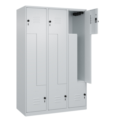 Die wichtigsten Maße des C+P Garderobenschranks Classic Plus auf einen Blick:Je Abteil eine Kleiderstange mit 3 verdrehsicheren Doppelschiebehaken. Flügeltür mit Etikettenrahmen und Lüftungsschlitzen. Die innenliegenden Drehbolzen der einschlagenden Türen bieten den Vorteil einer sauberen Optik, da keine Schrauben oder Scharniere von außen sichtbar sind. Dadurch wird das Design des Schrankes nicht beeinträchtigt und das gesamte Möbelstück wirkt hochwertiger. Damit ist auch die glatte Oberfläche leichter zu reinigen, da keine Schmutz- oder Staubablagerungen an unzugänglichen Stellen zu befürchten sind. Jede Tür ist serienmäßig mit einer Anschlagsdämpfung ausgestattet, so dass, auch durch ein schwungvolles Schließen, die Tür nicht zuknallt. Das trägt nicht nur zu einer angenehmeren Geräuschkulisse bei, sondern schont auch den Stahlschrank vor Beschädigungen. Von der Natur inspiriert schafft der BIONIC Steel Frame eine besonders effiziente und stabile Konstruktion. Durch eine raffinierte innere Struktur aus Faltungen, Streben und Zwischenräumen, sowie höhere Materialstärke an entscheidenden Stellen, wie z. B. im vorderen Bereich der Seitenwände und in den Trennwand- und Kastenprofilen, wird die Verwindungssteifigkeit zusätzlich erhöht. Verschließbar mit Sicherheits-Drehriegel für Vorhängeschloss. Das Sicherheitsschloss ist besonders aufbruchsicher, da es im verschlossenen Zustand durchdreht und erst nach Entfernung des Schlosses einrastet. Passend für alle Vorhängeschlösser mit einer Bügelstärke von 6 - 8 mm. Die zusätzlichen Lüftungsöffnungen im Abteil, kombiniert mit den Lüftungsschlitzen in der Tür, verbessern den Luftstrom. Dadurch wird der Schrankinhalt besser belüftet und trocknet schneller, ohne unangenehme Gerüche zu verursachen. Für eine besonders schlanke und raumsparende Optik steht der Schrank ohne Sockel oder Füße direkt auf dem Boden. Lediglich Bodenausgleichsschrauben sorgen für einen wackelfreien Stand bei eventuellen Bodenunebenheiten. Der Schrankboden ist für einen erhöhten Korrosionsschutz zusätzlich verzinkt. Konstruktion aus Stahl, stabil verschweißt. Das macht die Konstruktion besonders robust und widerstandsfähig und somit langlebiger. Die verschweißten Ecken und Kanten des Korpus gewährleisten eine höhere Dichtigkeit und somit eine bessere Schutzfunktion gegen Staub, Feuchtigkeit und Schmutz als eine geschraubte Konstruktion. Zudem sind keine regelmäßigen Wartungsarbeiten und Nachjustierungen nötig. Korpus mit Einbrennlackierung in RAL7035 Lichtgrau, Front mit Einbrennlackierung in RAL7035 Lichtgrau.