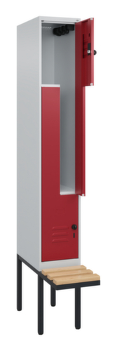 Die wichtigsten Maße des C+P Garderobenschranks Classic Plus auf einen Blick:Je Abteil eine Kleiderstange mit 3 verdrehsicheren Doppelschiebehaken. Z-Flügeltür mit Etikettenrahmen und Lüftungsschlitzen. Die innenliegenden Drehbolzen der einschlagenden Türen bieten den Vorteil einer sauberen Optik, da keine Schrauben oder Scharniere von außen sichtbar sind. Dadurch wird das Design des Schrankes nicht beeinträchtigt und das gesamte Möbelstück wirkt hochwertiger. Damit ist auch die glatte Oberfläche leichter zu reinigen, da keine Schmutz- oder Staubablagerungen an unzugänglichen Stellen zu befürchten sind. Jede Tür ist serienmäßig mit einer Anschlagsdämpfung ausgestattet, so dass, auch durch ein schwungvolles Schließen, die Tür nicht zuknallt. Das trägt nicht nur zu einer angenehmeren Geräuschkulisse bei, sondern schont auch den Stahlschrank vor Beschädigungen. Von der Natur inspiriert schafft der BIONIC Steel Frame eine besonders effiziente und stabile Konstruktion. Durch eine raffinierte innere Struktur aus Faltungen, Streben und Zwischenräumen, sowie höhere Materialstärke an entscheidenden Stellen, wie z. B. im vorderen Bereich der Seitenwände und in den Trennwand- und Kastenprofilen, wird die Verwindungssteifigkeit zusätzlich erhöht. Verschließbar mit Sicherheits-Drehriegel für Vorhängeschloss. Das Sicherheitsschloss ist besonders aufbruchsicher, da es im verschlossenen Zustand durchdreht und erst nach Entfernung des Schlosses einrastet. Passend für alle Vorhängeschlösser mit einer Bügelstärke von 6 - 8 mm. Die zusätzlichen Lüftungsöffnungen im Abteil, kombiniert mit den Lüftungsschlitzen in der Tür, verbessern den Luftstrom. Dadurch wird der Schrankinhalt besser belüftet und trocknet schneller, ohne unangenehme Gerüche zu verursachen. Die schwebende Sitzbank bietet mehr Freiraum für ein bequemes An- und Ausziehen, ohne dass die Füße des Gestells im Weg sind. Die Leisten sind aus Buchenholz. Konstruktion aus Stahl, stabil verschweißt. Das macht die Konstruktion besonders robust und widerstandsfähig und somit langlebiger. Die verschweißten Ecken und Kanten des Korpus gewährleisten eine höhere Dichtigkeit und somit eine bessere Schutzfunktion gegen Staub, Feuchtigkeit und Schmutz als eine geschraubte Konstruktion. Zudem sind keine regelmäßigen Wartungsarbeiten und Nachjustierungen nötig. Korpus mit Einbrennlackierung in RAL7035 Lichtgrau, Front mit Einbrennlackierung in RAL3003 Rubinrot.