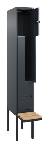 Die wichtigsten Maße des C+P Garderobenschranks Classic Plus auf einen Blick:Je Abteil eine Kleiderstange mit 3 verdrehsicheren Doppelschiebehaken. Z-Flügeltür mit Etikettenrahmen und Lüftungsschlitzen. Die innenliegenden Drehbolzen der einschlagenden Türen bieten den Vorteil einer sauberen Optik, da keine Schrauben oder Scharniere von außen sichtbar sind. Dadurch wird das Design des Schrankes nicht beeinträchtigt und das gesamte Möbelstück wirkt hochwertiger. Damit ist auch die glatte Oberfläche leichter zu reinigen, da keine Schmutz- oder Staubablagerungen an unzugänglichen Stellen zu befürchten sind. Jede Tür ist serienmäßig mit einer Anschlagsdämpfung ausgestattet, so dass, auch durch ein schwungvolles Schließen, die Tür nicht zuknallt. Das trägt nicht nur zu einer angenehmeren Geräuschkulisse bei, sondern schont auch den Stahlschrank vor Beschädigungen. Von der Natur inspiriert schafft der BIONIC Steel Frame eine besonders effiziente und stabile Konstruktion. Durch eine raffinierte innere Struktur aus Faltungen, Streben und Zwischenräumen, sowie höhere Materialstärke an entscheidenden Stellen, wie z. B. im vorderen Bereich der Seitenwände und in den Trennwand- und Kastenprofilen, wird die Verwindungssteifigkeit zusätzlich erhöht. Verschließbar mit Sicherheits-Drehriegel für Vorhängeschloss. Das Sicherheitsschloss ist besonders aufbruchsicher, da es im verschlossenen Zustand durchdreht und erst nach Entfernung des Schlosses einrastet. Passend für alle Vorhängeschlösser mit einer Bügelstärke von 6 - 8 mm. Die zusätzlichen Lüftungsöffnungen im Abteil, kombiniert mit den Lüftungsschlitzen in der Tür, verbessern den Luftstrom. Dadurch wird der Schrankinhalt besser belüftet und trocknet schneller, ohne unangenehme Gerüche zu verursachen. Die schwebende Sitzbank bietet mehr Freiraum für ein bequemes An- und Ausziehen, ohne dass die Füße des Gestells im Weg sind. Die Leisten sind aus Buchenholz. Konstruktion aus Stahl, stabil verschweißt. Das macht die Konstruktion besonders robust und widerstandsfähig und somit langlebiger. Die verschweißten Ecken und Kanten des Korpus gewährleisten eine höhere Dichtigkeit und somit eine bessere Schutzfunktion gegen Staub, Feuchtigkeit und Schmutz als eine geschraubte Konstruktion. Zudem sind keine regelmäßigen Wartungsarbeiten und Nachjustierungen nötig. Korpus mit Einbrennlackierung in RAL7016 Anthrazitgrau, Front mit Einbrennlackierung in RAL7016 Anthrazitgrau.