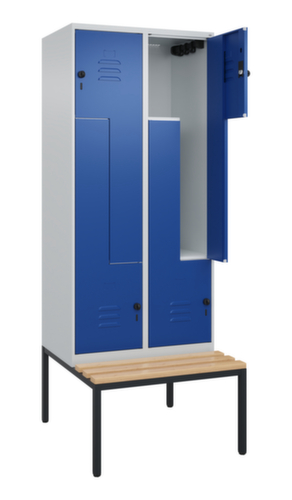 Die wichtigsten Maße des C+P Garderobenschranks Classic Plus auf einen Blick:Je Abteil eine Kleiderstange mit 3 verdrehsicheren Doppelschiebehaken. Z-Flügeltür mit Etikettenrahmen und Lüftungsschlitzen. Die innenliegenden Drehbolzen der einschlagenden Türen bieten den Vorteil einer sauberen Optik, da keine Schrauben oder Scharniere von außen sichtbar sind. Dadurch wird das Design des Schrankes nicht beeinträchtigt und das gesamte Möbelstück wirkt hochwertiger. Damit ist auch die glatte Oberfläche leichter zu reinigen, da keine Schmutz- oder Staubablagerungen an unzugänglichen Stellen zu befürchten sind. Jede Tür ist serienmäßig mit einer Anschlagsdämpfung ausgestattet, so dass, auch durch ein schwungvolles Schließen, die Tür nicht zuknallt. Das trägt nicht nur zu einer angenehmeren Geräuschkulisse bei, sondern schont auch den Stahlschrank vor Beschädigungen. Von der Natur inspiriert schafft der BIONIC Steel Frame eine besonders effiziente und stabile Konstruktion. Durch eine raffinierte innere Struktur aus Faltungen, Streben und Zwischenräumen, sowie höhere Materialstärke an entscheidenden Stellen, wie z. B. im vorderen Bereich der Seitenwände und in den Trennwand- und Kastenprofilen, wird die Verwindungssteifigkeit zusätzlich erhöht. Verschließbar mit Sicherheits-Drehriegel für Vorhängeschloss. Das Sicherheitsschloss ist besonders aufbruchsicher, da es im verschlossenen Zustand durchdreht und erst nach Entfernung des Schlosses einrastet. Passend für alle Vorhängeschlösser mit einer Bügelstärke von 6 - 8 mm. Die zusätzlichen Lüftungsöffnungen im Abteil, kombiniert mit den Lüftungsschlitzen in der Tür, verbessern den Luftstrom. Dadurch wird der Schrankinhalt besser belüftet und trocknet schneller, ohne unangenehme Gerüche zu verursachen. Die untergebaute Sitzbank sorgt für eine effiziente Nutzung des verfügbaren Raumes. Sie ermöglicht ein bequemes An- und Ausziehen und bietet direkt noch Stauraum, ohne zusätzlichen Platz zu beanspruchen. Die Leisten sind aus Buchenholz. Konstruktion aus Stahl, stabil verschweißt. Das macht die Konstruktion besonders robust und widerstandsfähig und somit langlebiger. Die verschweißten Ecken und Kanten des Korpus gewährleisten eine höhere Dichtigkeit und somit eine bessere Schutzfunktion gegen Staub, Feuchtigkeit und Schmutz als eine geschraubte Konstruktion. Zudem sind keine regelmäßigen Wartungsarbeiten und Nachjustierungen nötig. Korpus mit Einbrennlackierung in RAL7035 Lichtgrau, Front mit Einbrennlackierung in RAL5010 Enzianblau.