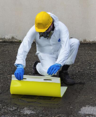 Geeignet zum Verhindern des Eindringens unerwünschter Flüssigkeiten in die Kanalisation oder den Boden bei Leckagen. Ausgestattet mit sich formgerecht an die Bodenbeschaffung anpassender Kunststoffmischung, die auf der Unterseite angebracht ist. Verarbeitung extrem dicht und flexibel.