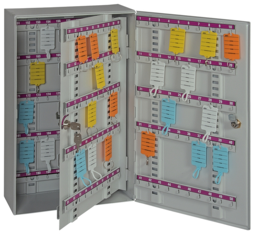 Ausgestattet mit individuell verstellbarer, fortlaufend nummerierter Hakenleiste für benutzerfreundliche Organisation der Schlüssel. Dank der Flügeltür haben Sie eine staubgeschützte Lagerung und Übersichtlichkeit in Einem. Verschließbar mit Zylinderschloss. Verriegelung 1-seitig. Konstruktion aus Stahlblech. Korpus mit schlag- und kratzfester Pulverbeschichtung in RAL7035 Lichtgrau. Front mit schlag- und kratzfester Pulverbeschichtung in RAL7035 Lichtgrau. Vorbereitet zur Rückwandverankerung.