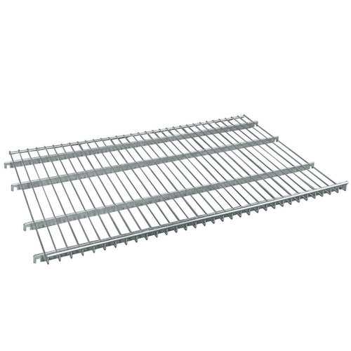 Der Boden wird eingehängt. Gegen das Abrutschen von abgelegten Gegenständen mit 20 mm hohem Rahmen ausgestattet. Aus Drahtgitter, galvanisch blau verzinkt.