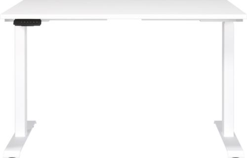 Platte aus Spanplatte mit kratzfester und pflegeleichter Melaminharzbeschichtung in Dekor weiß. Plattenform eckig. Kante mit schlagfestem ABS-Umleimer, der vor unschönen Rissen und Ausbrechen schützt. Doppel-T-Fußgestell aus Metall mit schlag- und kratzfester Pulverbeschichtung in weiß. Höhenverstellung durch Elektromotor. Gestell mit nivellierbaren Kunststoffgleitern, mit denen sich Bodenunebenheiten optimal ausbessern lassen. Mit Stromkabel, Stecker und Bedieneinheit elektrifizierbar.