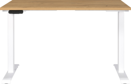 Platte aus Spanplatte mit kratzfester und pflegeleichter Melaminharzbeschichtung in Dekor Grandson-Eiche. Plattenform eckig. Kante mit schlagfestem ABS-Umleimer, der vor unschönen Rissen und Ausbrechen schützt. Doppel-T-Fußgestell aus Metall mit schlag- und kratzfester Pulverbeschichtung in weiß. Höhenverstellung durch Elektromotor. Gestell mit nivellierbaren Kunststoffgleitern, mit denen sich Bodenunebenheiten optimal ausbessern lassen. Mit Stromkabel, Stecker und Bedieneinheit elektrifizierbar.