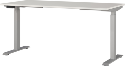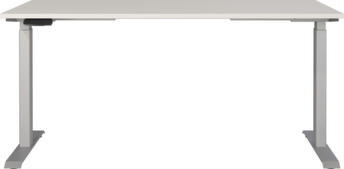 Platte aus Spanplatte mit kratzfester und pflegeleichter Melaminharzbeschichtung in Dekor lichtgrau. Kante mit schlagfestem ABS-Umleimer, der vor unschönen Rissen und Ausbrechen schützt. Doppel-T-Fußgestell aus Metall mit schlag- und kratzfester Pulverbeschichtung in silber. Gestell mit nivellierbaren Kunststoffgleitern, mit denen sich Bodenunebenheiten optimal ausbessern lassen. Mit Stromkabel, Stecker und Bedieneinheit elektrifizierbar.