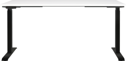 Platte aus Spanplatte mit kratzfester und pflegeleichter Melaminharzbeschichtung in Dekor weiß. Kante mit schlagfestem ABS-Umleimer, der vor unschönen Rissen und Ausbrechen schützt. Doppel-T-Fußgestell aus Metall mit schlag- und kratzfester Pulverbeschichtung in schwarz. Gestell mit nivellierbaren Kunststoffgleitern, mit denen sich Bodenunebenheiten optimal ausbessern lassen. Mit Stromkabel, Stecker und Bedieneinheit elektrifizierbar.