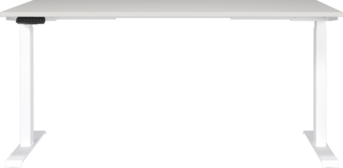 Platte aus Spanplatte mit kratzfester und pflegeleichter Melaminharzbeschichtung in Dekor lichtgrau. Kante mit schlagfestem ABS-Umleimer, der vor unschönen Rissen und Ausbrechen schützt. Doppel-T-Fußgestell aus Metall mit schlag- und kratzfester Pulverbeschichtung in weiß. Gestell mit nivellierbaren Kunststoffgleitern, mit denen sich Bodenunebenheiten optimal ausbessern lassen. Mit Stromkabel, Stecker und Bedieneinheit elektrifizierbar.