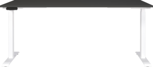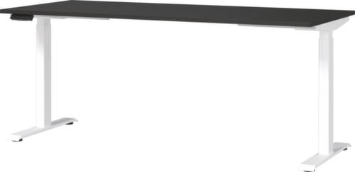 Platte aus Spanplatte mit pflegeleichter Melaminharzbeschichtung in Dekor graphit. Kante mit schlagfestem ABS-Umleimer, der vor unschönen Rissen und Ausbrechen schützt. Doppel-T-Fußgestell aus Metall mit schlag- und kratzfester Pulverbeschichtung in weiß. Gestell mit nivellierbaren Kunststoffgleitern, mit denen sich Bodenunebenheiten optimal ausbessern lassen. Mit Stromkabel, Stecker und Bedieneinheit elektrifizierbar.