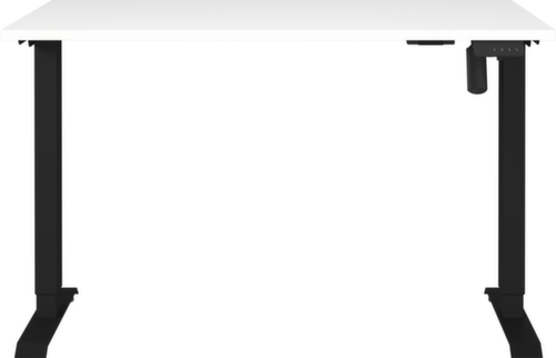 Platte aus Spanplatte mit pflegeleichter Melaminharzbeschichtung in Dekor weiß. Kante mit schlagfestem ABS-Umleimer, der vor unschönen Rissen und Ausbrechen schützt. T-Fußgestell aus Metall mit schlag- und kratzfester Pulverbeschichtung in schwarz. Höhenverstellung durch Elektromotor. Gestell mit nivellierbaren Kunststoffgleitern, mit denen sich Bodenunebenheiten optimal ausbessern lassen.