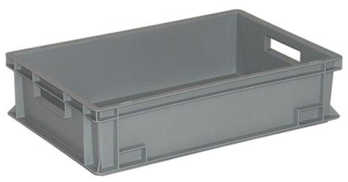 Maßlich auf die Europalette abgestimmt. Aus bruchsicherem Polypropylen in grau. Wände geschlossen, Boden geschlossen. Boden mit Verstärkung durch Verstärkungsrippen. Einfacher Transport durch Muschelgriffe. Mehrfach stapelbar. Lebensmittelgeeignet. Für Rollenbahnen geeignet. Temperaturbeständig -20 °C bis +80 °C. Geeignet für verschiedene Stoffe, bitte anfragen.