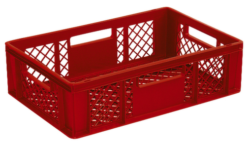 Maßlich auf die Europalette abgestimmt. Aus bruchsicherem Polypropylen in rot. Wände durchbrochen, Boden durchbrochen. Boden mit Verstärkung durch Verstärkungsrippen. Einfacher Transport durch Muschelgriffe. Mehrfach stapelbar. Lebensmittelgeeignet. Für Rollenbahnen geeignet. Temperaturbeständig -20 °C bis +80 °C. Geeignet für verschiedene Stoffe, bitte anfragen. recycelbar.