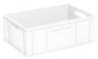 Maßlich auf die Europalette abgestimmt. Aus bruchsicherem Polypropylen in weiß. Wände geschlossen, Boden geschlossen. Boden mit Verstärkung durch Verstärkungsrippen. Einfacher Transport durch Muschelgriffe. Mehrfach stapelbar. Lebensmittelgeeignet. Für Rollenbahnen geeignet. Temperaturbeständig -20 °C bis +80 °C. Geeignet für verschiedene Stoffe, bitte anfragen.