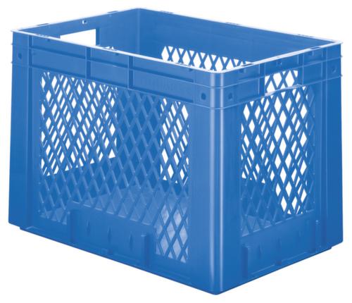 Maßlich auf die Europalette abgestimmt. Aus bruchsicherem Polypropylen in blau. Wände durchbrochen ohne Eingrifföffnung, Boden geschlossen. Boden mit Verstärkung durch Verstärkungsrippen. Einfacher Transport durch Tragegriffe. Mit Etikettenhalter an allen Seiten. Mehrfach stapelbar. Lebensmittelgeeignet. Für Rollenbahnen geeignet. Geeignet für verschiedene Stoffe, bitte anfragen.