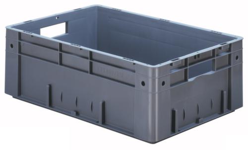 Maßlich auf die Europalette abgestimmt. Aus bruchsicherem Polypropylen in grau. Wände geschlossen ohne Eingrifföffnung, Boden geschlossen. Boden mit Verstärkung durch Verstärkungsrippen. Einfacher Transport durch Tragegriffe. Mit Etikettenhalter an allen Seiten. Mehrfach stapelbar. Lebensmittelgeeignet. Für Rollenbahnen geeignet. Geeignet für verschiedene Stoffe, bitte anfragen. recycelbar.