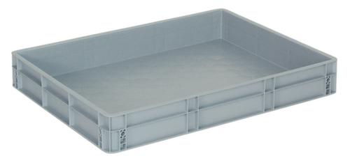 Maßlich auf die Europalette abgestimmt. Aus bruchsicherem Polypropylen in grau. Wände geschlossen, Boden geschlossen. Mehrfach stapelbar. Lebensmittelgeeignet. Für Rollenbahnen geeignet.