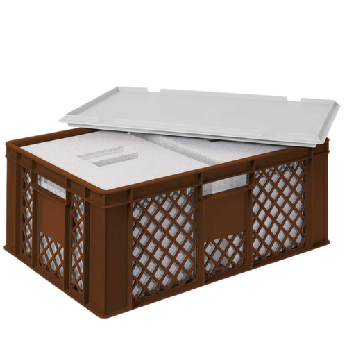 Die wichtigsten Maße des Stapelbehälters auf einen Blick:Im Euromaß. Aus Hochdruck-Polyethylen (Isolierbox aus expandiertem Polystyrol) in braun. Wände durchbrochen. Auflagedeckel für innenliegende Isolierbox. Einfacher Transport durch Durchfassgriffe. Sowohl mit als auch ohne Deckel sicher mehrfach stapelbar. Lebensmittelgeeignet. Temperaturbeständig -40 °C bis +60 °C, kurzzeitig bis +75 °C. Geeignet für Säuren, Laugen und Fette.