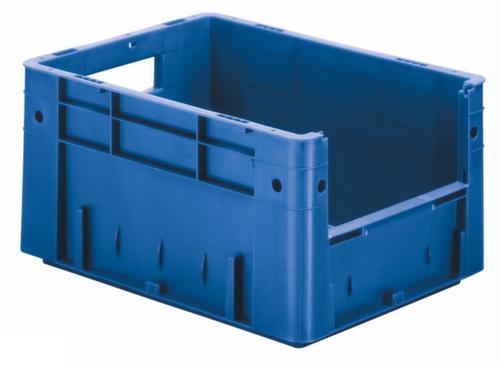 Maßlich auf die Europalette abgestimmt. Aus bruchsicherem Polypropylen in blau. Wände geschlossen mit stirnseitiger Eingrifföffnung, Boden geschlossen. Boden mit Verstärkung durch Verstärkungsrippen. Einfacher Transport durch Tragegriffe. Mit Etikettenhalter an allen Seiten. Mehrfach stapelbar. Lebensmittelgeeignet. Für Rollenbahnen geeignet. Geeignet für verschiedene Stoffe, bitte anfragen. recycelbar.