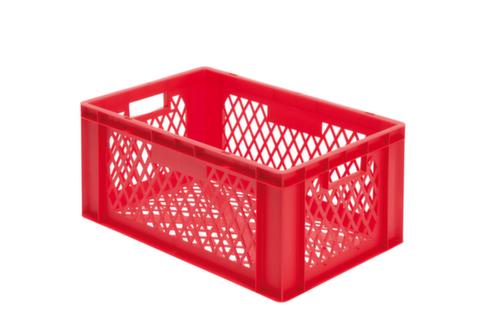 Maßlich auf die Europalette abgestimmt. Aus bruchsicherem Polypropylen in rot. Wände durchbrochen, Boden durchbrochen. Einfacher Transport durch Tragegriffe. Mehrfach stapelbar. Lebensmittelgeeignet. Für Rollenbahnen geeignet. Temperaturbeständig -20 °C bis +80 °C. Geeignet für verschiedene Stoffe, bitte anfragen.