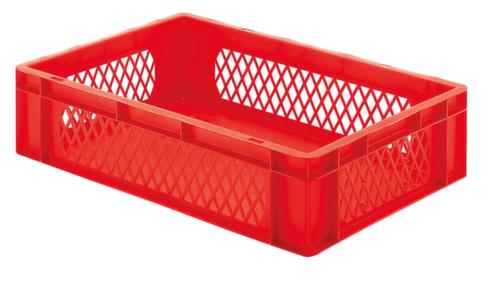 Maßlich auf die Europalette abgestimmt. Aus bruchsicherem Polypropylen in rot. Wände durchbrochen, Boden geschlossen. Mehrfach stapelbar. Lebensmittelgeeignet. Für Rollenbahnen geeignet. Temperaturbeständig -20 °C bis +80 °C. Geeignet für verschiedene Stoffe, bitte anfragen.