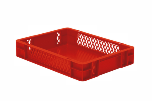 Maßlich auf die Europalette abgestimmt. Aus bruchsicherem Polypropylen in rot. Wände durchbrochen, Boden geschlossen. Mehrfach stapelbar. Lebensmittelgeeignet. Für Rollenbahnen geeignet. Temperaturbeständig -20 °C bis +80 °C.