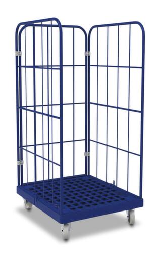 Aufbauten: 3 Wände (Drahtgitter). Konstruktion aus Stahl mit schlag- und kratzfester Pulverbeschichtung in ähnlich RAL5010 Enzianblau. Plattform aus Hochdruck-Polyethylen in ähnlich RAL5010 Enzianblau. Die untergebauten 2 Lenk- und 2 Bockrollen ermöglichen ein müheloses Bewegen mit hoher Spursicherheit auf geraden und kurvigen Strecken bei wenig Kraftaufwand. Rad Ø 108 mm. Mit bruchsicherer und robuster Polypropylen-Bereifung.