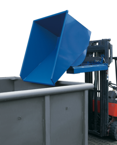 Die wichtigsten Maße des fetra Kippbehälters auf einen BlickDer Kippvorgang wird bequem vom Fahrersitz aus per Zugseilentriegelung ausgelöst. Nach der Entleerung schwenkt der Kippbehälter automatisch wieder in die Ausgangsposition zurück und die Kippsicherung rastet wieder automatisch ein. Mit einer Sicherungskette an den Einfahrtaschen kann der Kippbehälter zusätzlich am Stapler gegen Abrutschen gesichert werden . Der Kippbehälter ist auch für die Aufnahme von Flüssigkeiten geeignet - öl- und wasserdicht verschweißt. Robuste Konstruktion aus Stahl mit Lackierung in RAL5007 Brillantblau. Zum einfachen Transportieren und Entleeren nehmen Sie den Kippbehälter einfach mit dem Stapler über die Einfahrtaschen auf und bringen ihn auf die gewünschte Position und erforderliche Höhe.