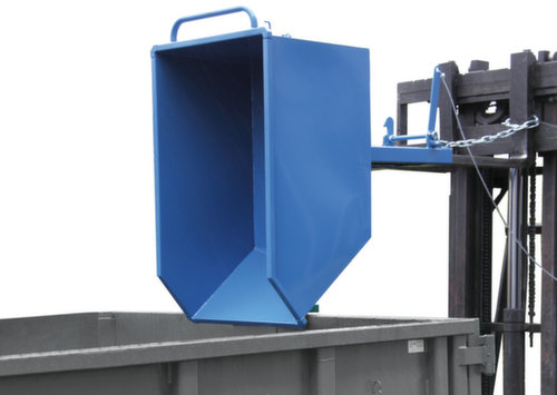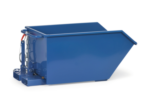 Die wichtigsten Maße des fetra Kippbehälters auf einen BlickDer Kippvorgang wird bequem vom Fahrersitz aus per Zugseilentriegelung ausgelöst. Das Rückführen in die Grundposition wird durch das Absenken auf den Boden erreicht und die Kippsicherung rastet wieder automatisch ein. Mit einer Sicherungskette an den Einfahrtaschen kann der Kippbehälter zusätzlich am Stapler gegen Abrutschen gesichert werden . Der Kippbehälter ist auch für die Aufnahme von Flüssigkeiten geeignet - öl- und wasserdicht verschweißt. Aufgefangene Flüssigkeiten, wie Öl oder Wasser, werden durch ein Sieb von den Feststoffen getrennt und können zeitsparend über ein Ablasshahn abgelassen werden, ohne den Container kippen zu müssen. Robuste Konstruktion aus Stahl mit Lackierung in RAL5007 Brillantblau. Zum einfachen Transportieren und Entleeren nehmen Sie den Kippbehälter einfach mit dem Stapler über die Einfahrtaschen auf und bringen ihn auf die gewünschte Position und erforderliche Höhe.