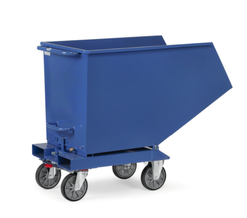 Der Kippvorgang wird bequem über eine Handgriff an der Rückseite manuell ausgelöst. Durch die Kippsicherung wird sichergestellt, dass der Behälter während des Transportes nicht unbeabsichtigt auskippt. Der Behälter ist öldicht verschweißt. Hohe Stabilität durch umlaufende gekantete Randverstärkung. Robuste Konstruktion aus Stahl mit schlag- und kratzfester Pulverbeschichtung in RAL5007 Brillantblau. Rollen und Gabeleinfahrtaschen ermöglichen einen einfachen Transport und die Stapleraufnahme für das Entleeren über einem Container. Durch 2 Lenk- und 2 Bockrollen und Schiebebügel lässt sich der Kippwagen leicht an den gewünschten Einsatzort verfahren. Die bodenschonende TPE-Bereifung hinterlässt keine Lenkspuren durch Materialabrieb. Zudem sorgt sie für einen geringen Widerstand beim Anfahren und läuft angenehm lange nach. Dies spart Kraft beim Schieben und Ziehen. Naben mit leichtgängigem und wartungsarmem Rillenkugellager. Die Feststeller an den Lenkrollen gewährleisten einen sicheren Stand.